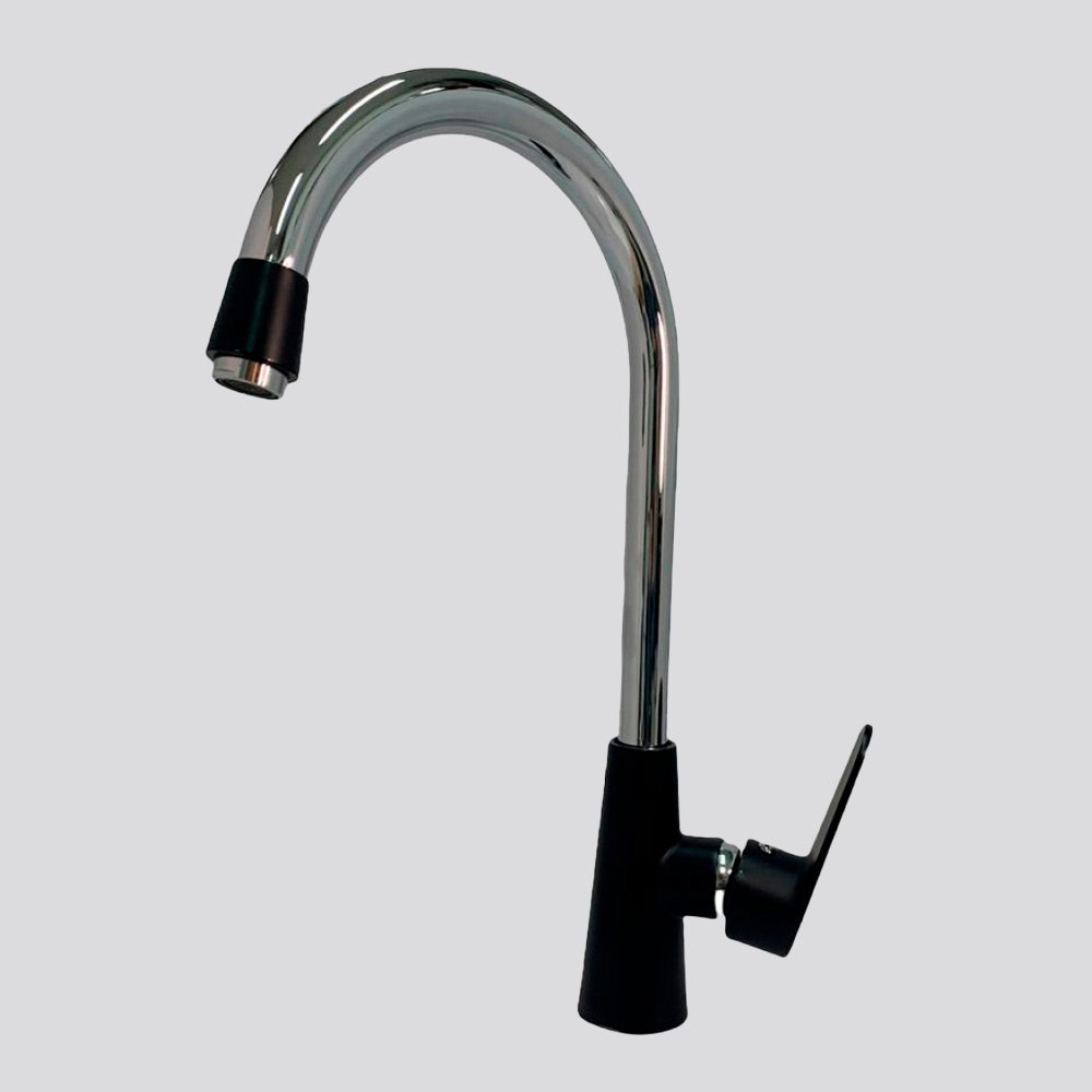 Grifería para lavaplatos con base negra y diseño funcional que realza cualquier cocina.