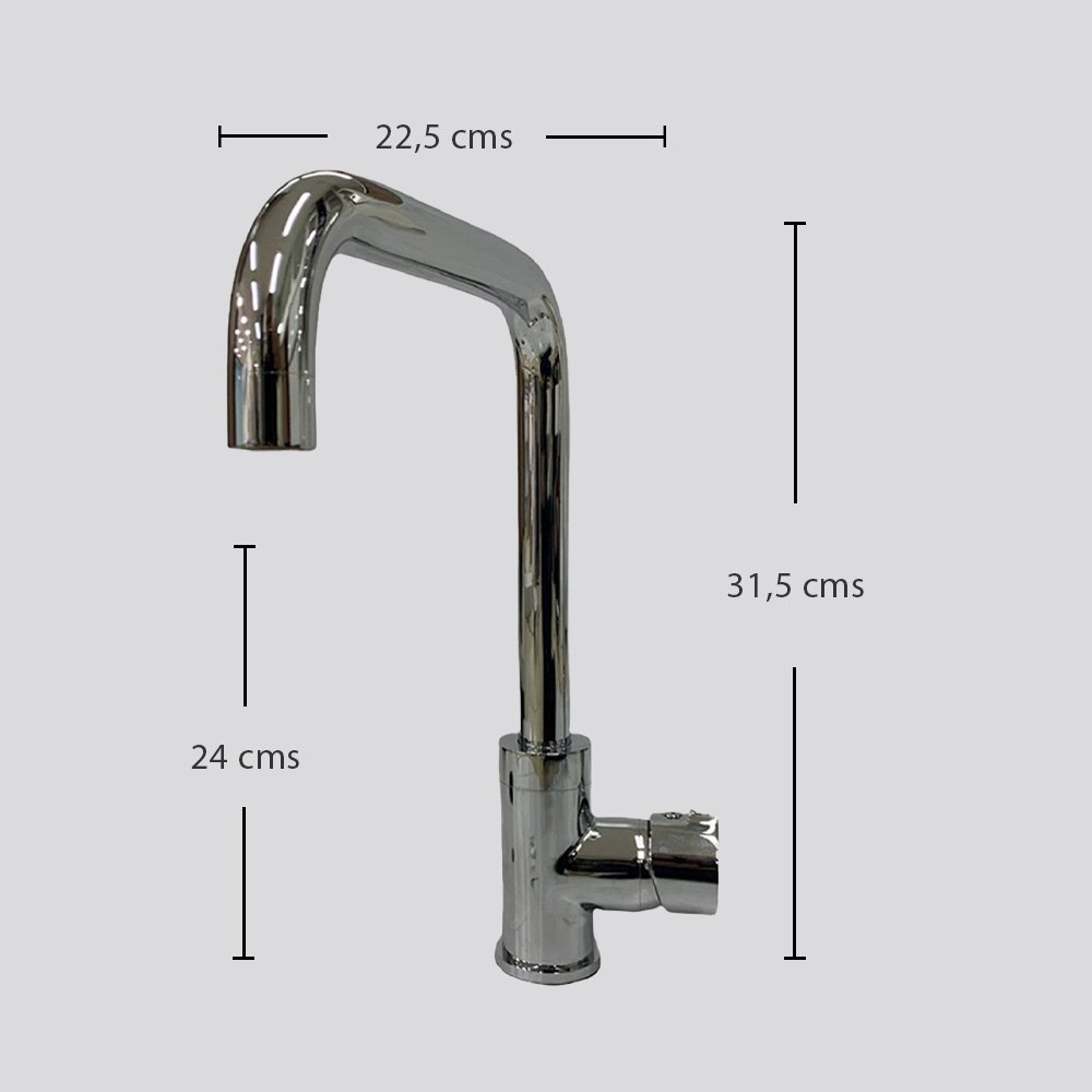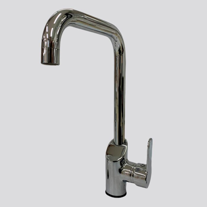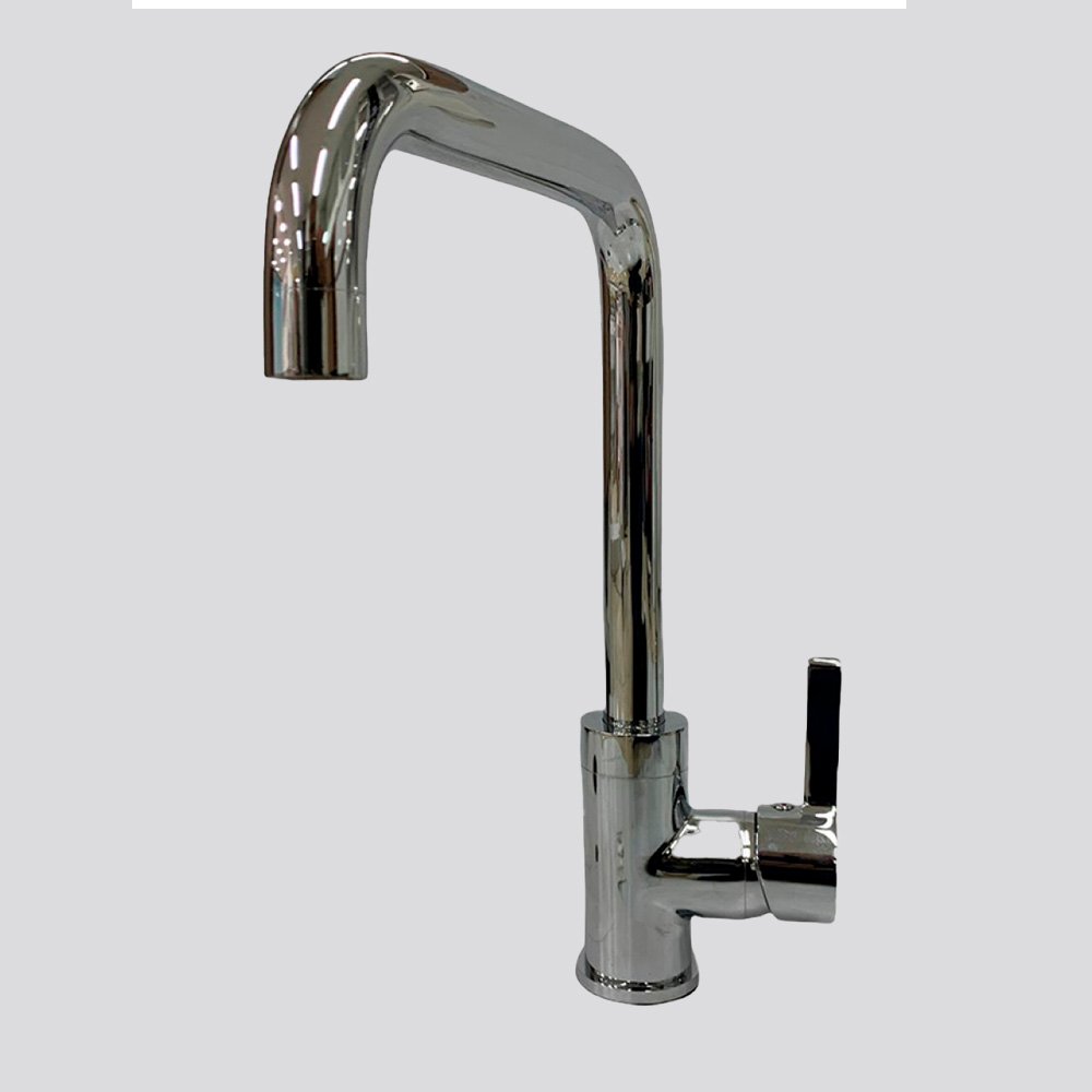 Grifería monocomando en metal cromado con cuello cuadrado, perfecta para cocinas modernas que buscan estilo y funcionalidad.
