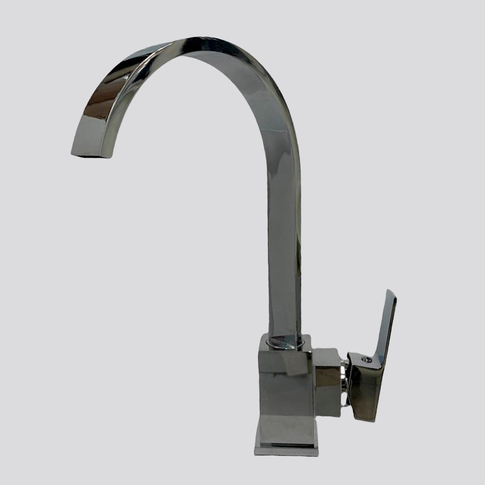 Grifería monocomando en acabado cromado con arco alto, ideal para cocinas que buscan elegancia y practicidad.