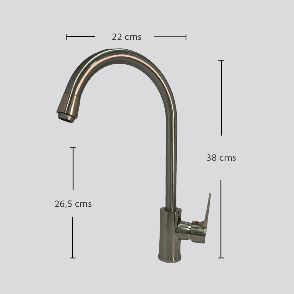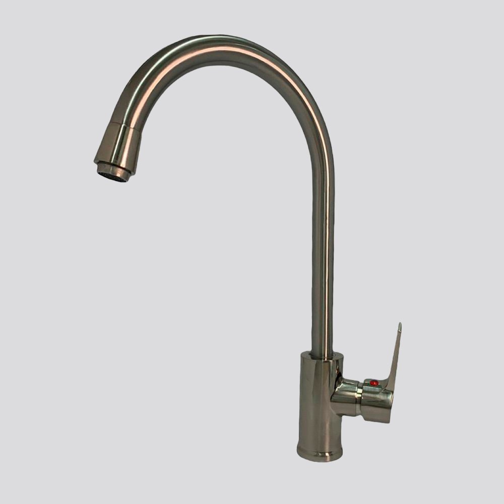Grifería monocomando en acero satinado con diseño ergonómico tipo “pato”, ideal para cocinas modernas que buscan comodidad y elegancia.