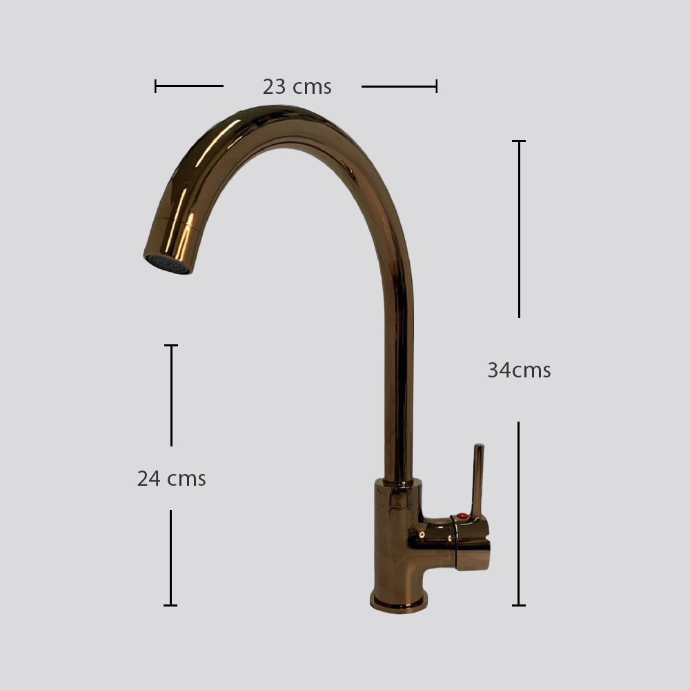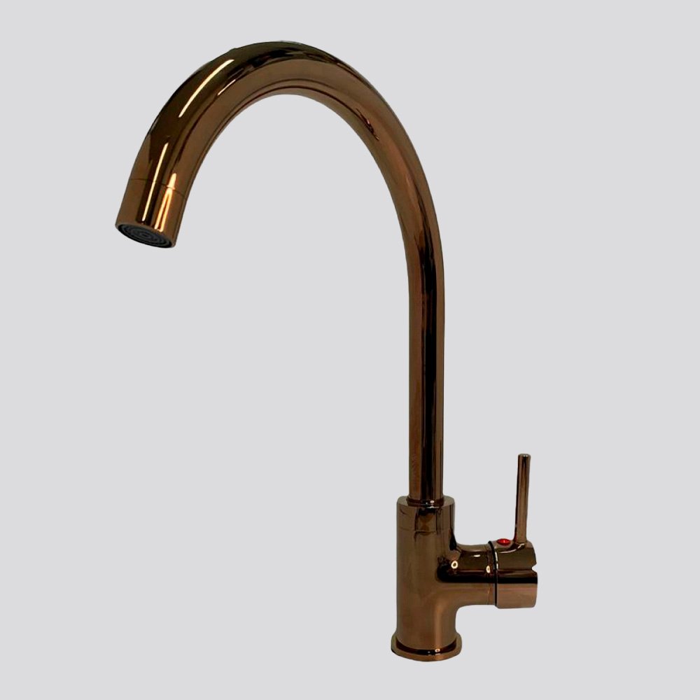 Grifería monocomando en elegante acabado oro rosa, con diseño de arco alto que combina estilo y practicidad.