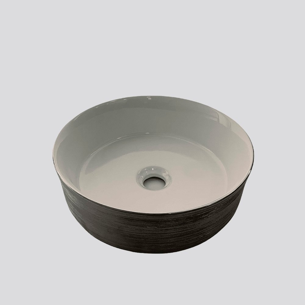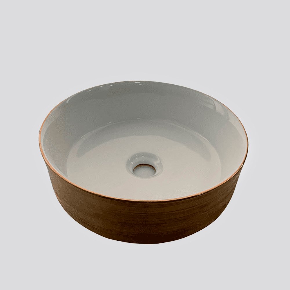 Colección de lavamanos redondos de porcelana con interior blanco y acabados exteriores en tonos elegantes como gris, plata y dorado. Diseños modernos que aportan estilo y distinción a cualquier baño.
